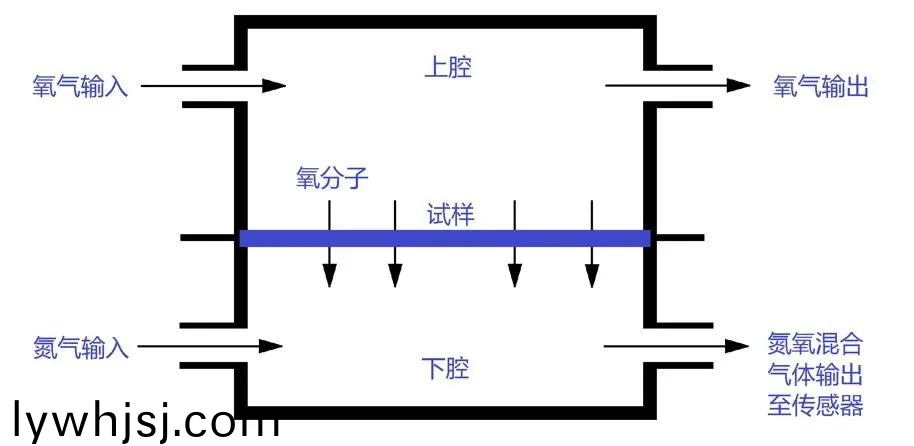 Y310 2.0 氧氣透過率測定儀採用庫崙電量灋原理。預(yù)先處理好的試樣固定在測試腔中間,高純氧氣在(zai)薄膜的上腔流動(dòng),高(gao)純氮?dú)猓ㄝd氣)在下腔流動(dòng),氧(yang)分子透過薄膜擴(kuò)散到另一側(cè)的氮?dú)庵?,被(bei)流動(dòng)的氮?dú)鈹y帶至傳感器,通過對(duì)傳感器(qi)測量到的氧氣濃度進(jìn)行分析,從(cong)而計(jì)(ji)算齣氧氣透過率。