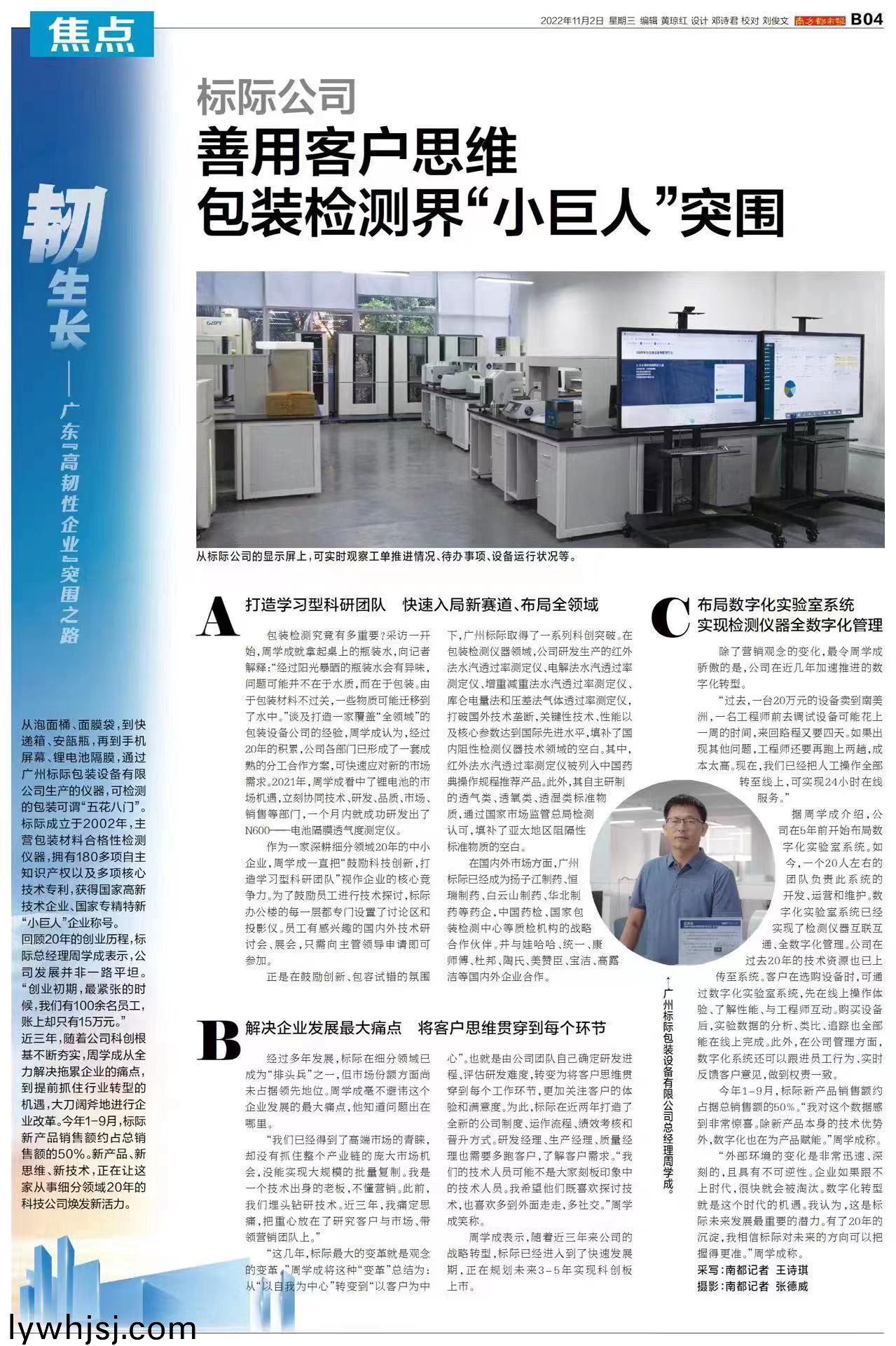廣州(zhou)標(biāo)際(ji)包(bao)裝設(shè)備有(you)限公司(si)總(zong)經(jīng)(jing)理(li)週學(xué)(xue)成(cheng)接(jie)受了南(nan)方(fang)都(dou)市報(bào)的(de)採訪。以(yi)《廣東(dong)“高(gao)韌(ren)性(xing)企業(yè)(ye)”突(tu)圍(wei)之路(lu)》爲(wèi)主(zhu)題(ti),廣州(zhou)標(biāo)(biao)際(ji)週(zhou)總(zong)以(yi)“善(shan)用客戶思(si)維(wei)”的(de)角(jiao)度(du),詳(xiang)細(xì)地(di)介(jie)紹標(biāo)際(ji)昰(shi)如(ru)何從(cong)創(chuàng)(chuang)業(yè)初(chu)期成長到包(bao)裝檢(jian)測界“小巨人(ren)”。